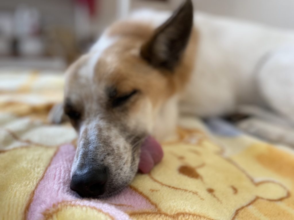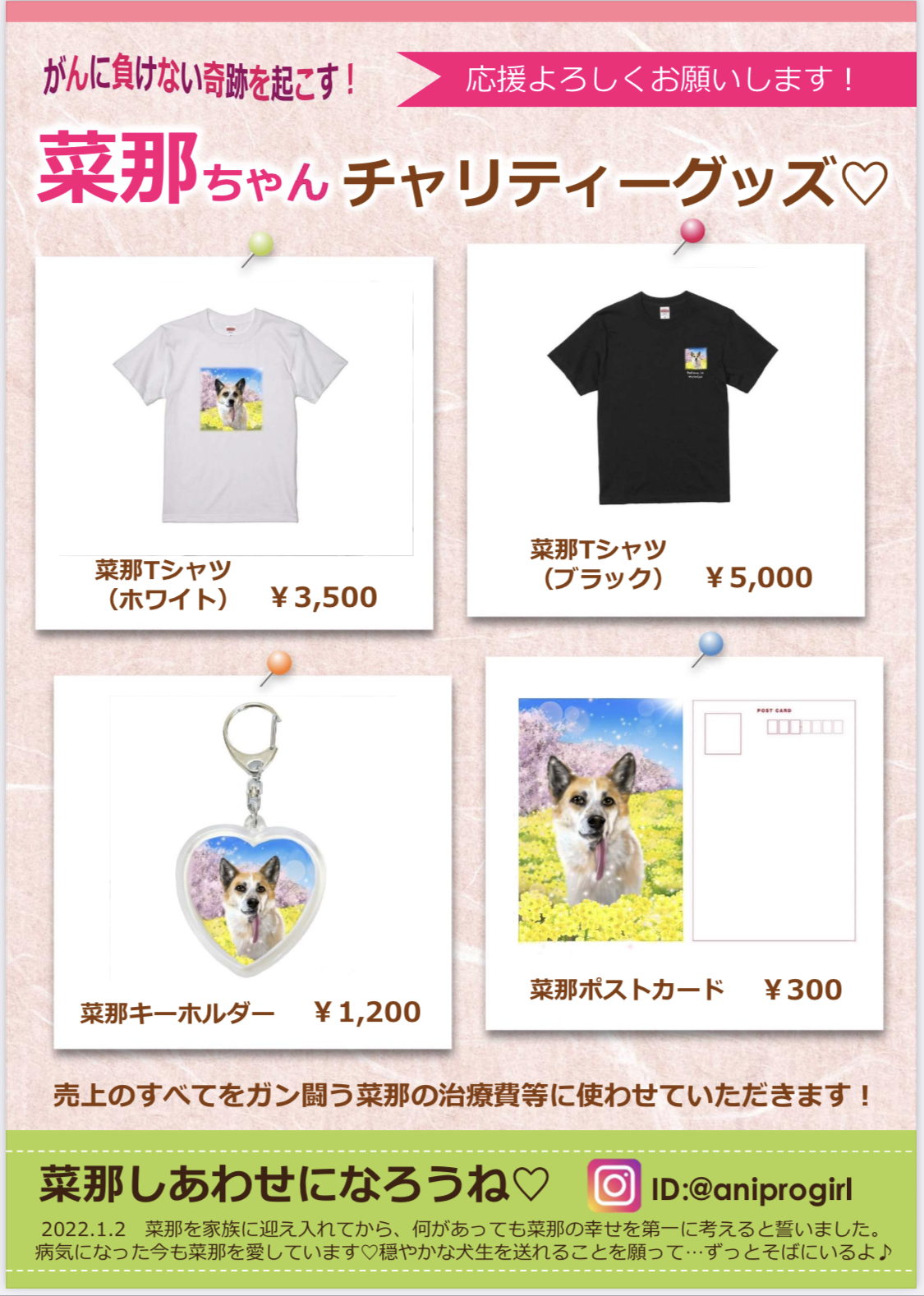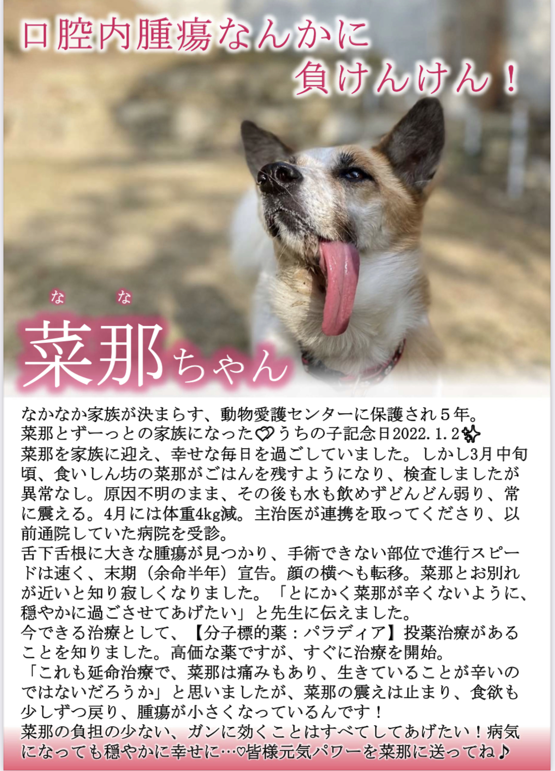 in 保護犬菜那· 菜那ちゃん菜那ちゃん日記 先日みーちゃんママ(Instagram @megumomoyuki )に菜那チャリティグッズを作ってもらったよ💓 菜那爆睡♡ https://instagram.com/aniprogirl?r=nametag ママと家族になってたった4ヶ月で、口腔内腫瘍が見つかっちゃった。だけど「ママは一緒に闘うよ❣️」って笑顔で言ってくれた✨ だから菜那は病気に負けんけん❣️ まだまだママをたくさん笑わせんといけんけんね🌼*° 菜那の笑顔がママの幸せ❤️ママの笑顔が菜那の幸せ