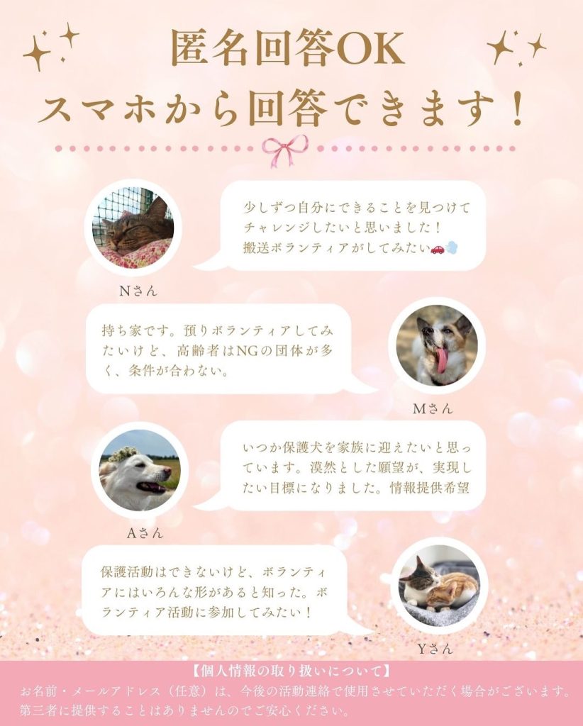 このアンケートは、元ボートレーサー 🚤池田明美さんと、進徳女子高等学校🏫で13年前に動物愛護活動をスタートさせた岡本美咲が共同で立ち上げました🐾